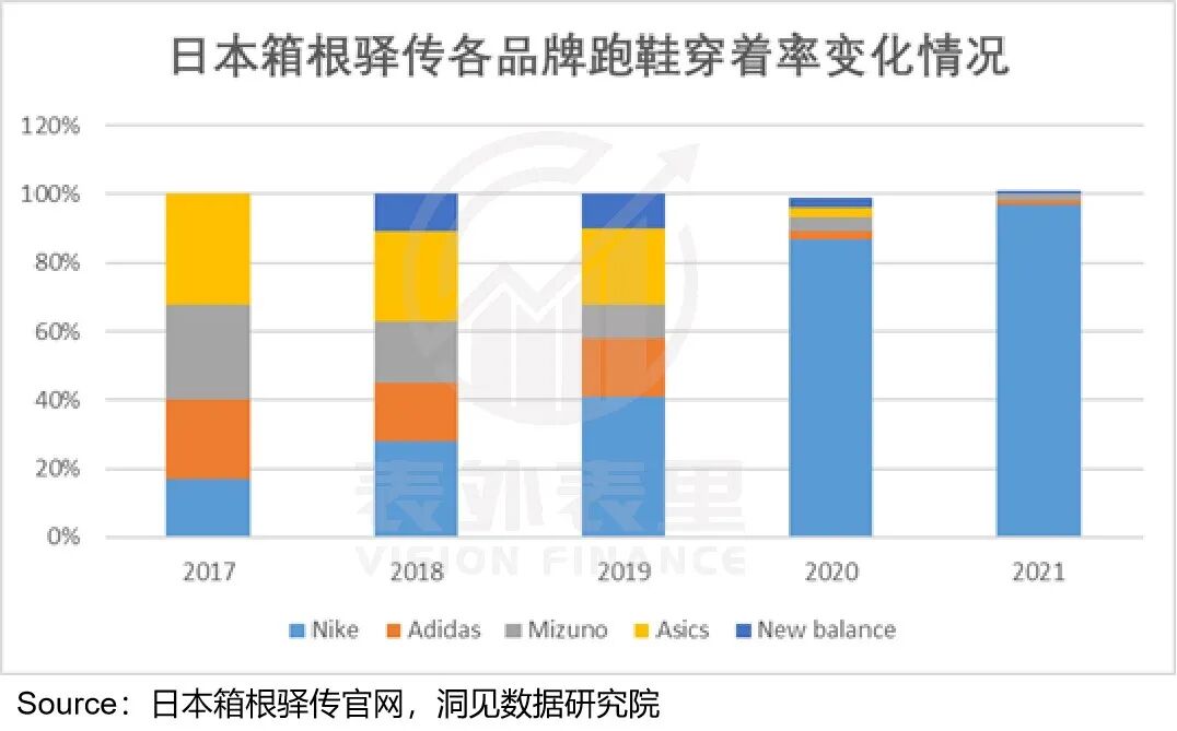 以日本箱根驿传马拉松接力赛为例,2017年,赛事上耐克穿着率仅17%,而vaporfly推出后,在该赛事上,耐克的穿着率持续上升,2021年达到97%。