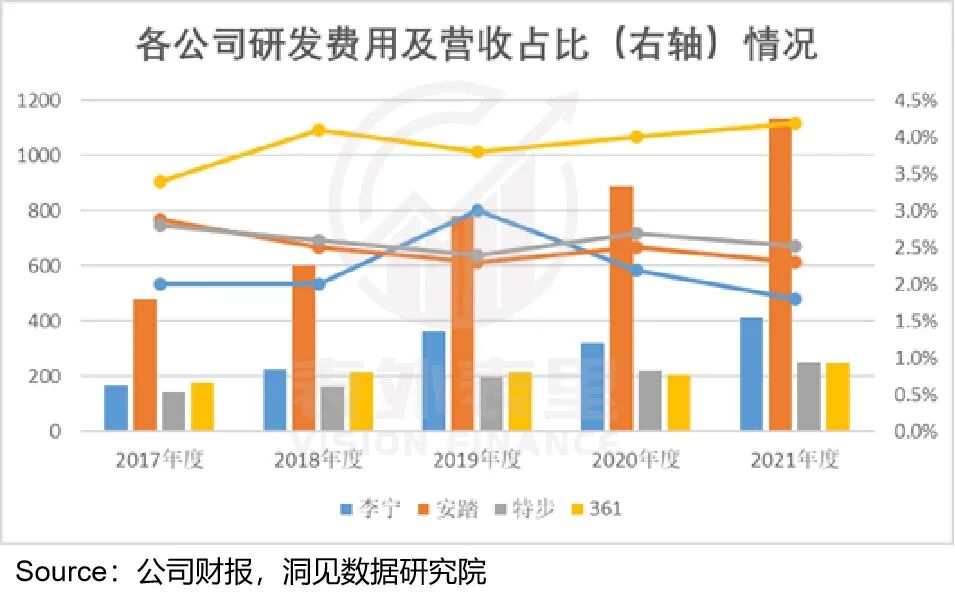 如下图,与同业相比,近几年李宁的研发投入占收入比并不高,且从2019开始,连续两年下降,到2021占比是几家中最低的。