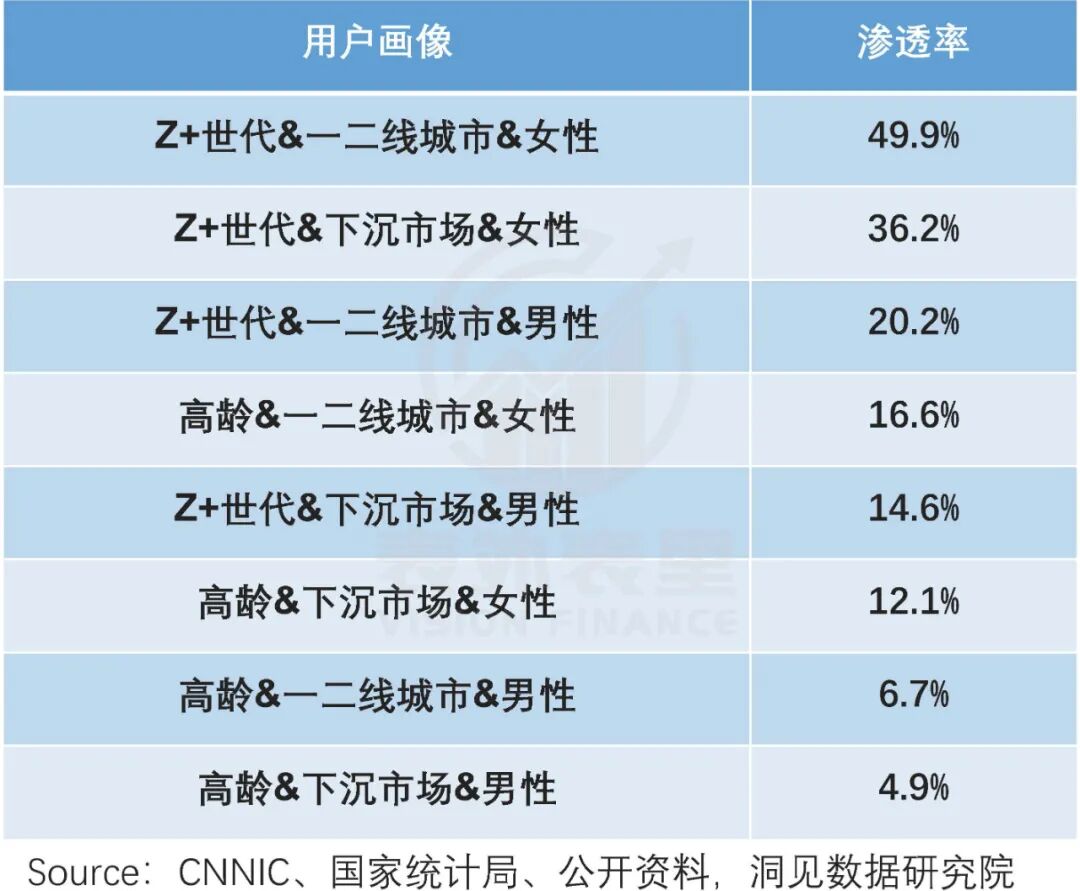 在上文的测算中,这一点也有验证:最接近高收入、高线城市年轻女性的年轻男性,渗透率最高(20%),并且正处于奇点时刻,接下来渗透率将会快速提升。