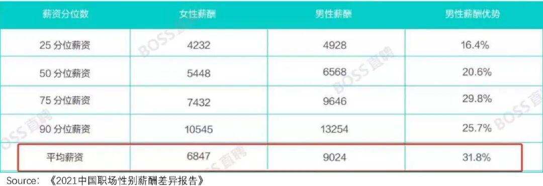 根据BOSS直聘发布的《2021中国职场性别薪酬差异报告》,2020年男性年均薪为9024元,同比上涨5.3%,平均薪酬较女性高31.8%。
