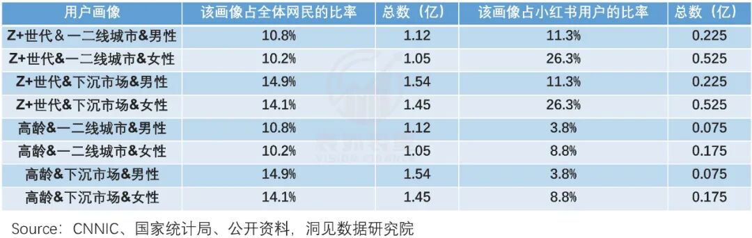如此一来,小红书想要“抢人”,可以瞄准的群体有4个,即其他年轻女性、男性、下沉和高龄用户。