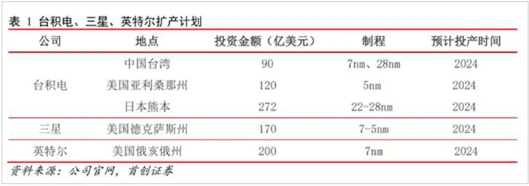 据IC Insights 统计,2022年全球半导体行业资本支出将达1904 亿美金,创历史新高。其中国际龙头扩产,均以更先进制程(如5nm)为主。