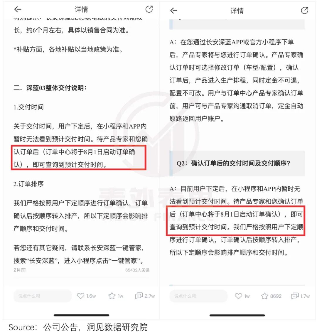 在7月26日-27日,长安深蓝官方发布的文件中明确写道:SL03在8月1日启动订单确认,即可查询到预计交付时间。