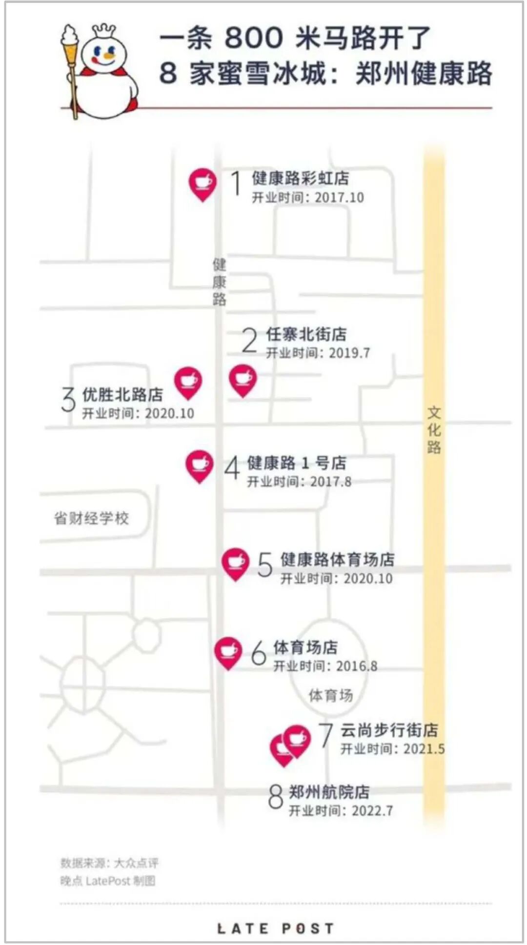 可以看到,蜜雪冰城在放开区域保护制度下,门店加盟密度已增加到惊人的程度。如下图,极端情况下,一条800米的马路上开了8家门店。