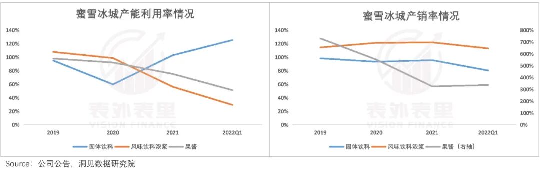 为此,蜜雪冰城拉足马力,扩充产能以辅助供给。如下图,部分产品的产能利用率持续高于100%,产销率也都在高位保持平稳运行。
