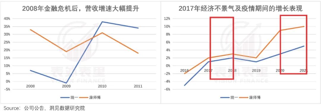 但上述康师傅们的经历透露,经济度下行周期本身不可持续。而经济形势好转时,可以看到,统一和康师傅的营收增速持续放缓,甚至出现负增长。