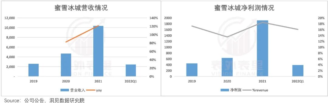 业务端的表现反馈在财务上,可以看到蜜雪冰城的营收持续逆势增长,2021年增速高达121.2%;同时,盈利情况也保持稳定,增速平均有16%。