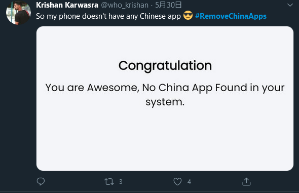不过这并不影响这款 App 蹭着印度网民的排华情绪蹿红,印度网民们纷纷在推特上公布自己的战绩,用键盘宣布与中国割袍断义。
