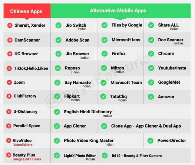 之后,一些手快的科技博主给印度网民们整理出了一份 “ 生活中常见中国 App ” 名单,还附上了它们或印度或国外开发的可替代 App 。