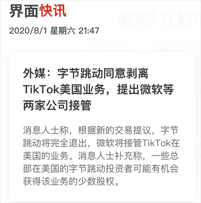 先是传出美国将因安全问题,封杀 TikTok ; 随后,微软等美国资本表示要买下 TikTok ,剥离字节跳动在美国的短视频业务。 8 月 1 日,有外媒称字节跳动同意业务被剥离。