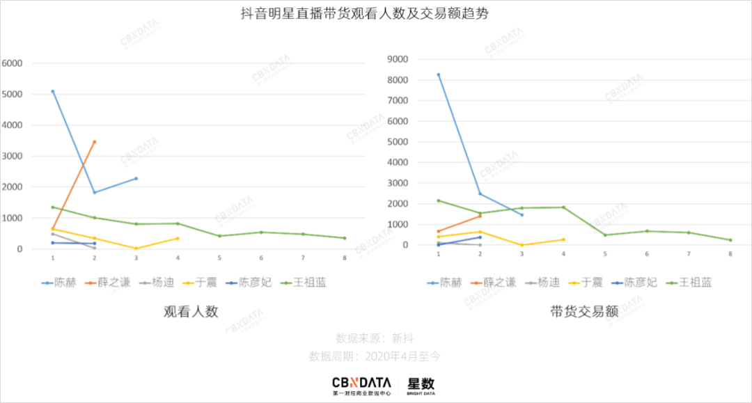 比如@陈赫 ,坐拥 8000 万+粉丝,首播交易额不负众望 8000 万+ ; 但同样是头部大 V 的@关晓彤 3000 万+ 粉丝,交易额却只有 340 万; 而粉丝只有 1000 万+ 的@袁姗姗 却有将近 5000 万; 佘诗曼区区 200 万粉丝,能带货 860 万……