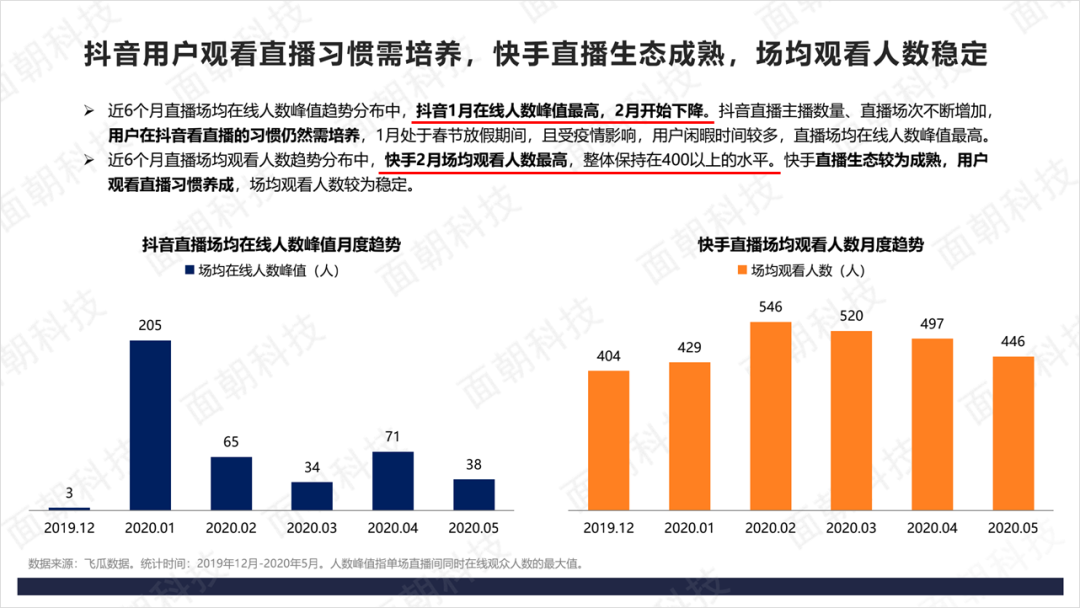 抖音直播平均观看人数自 2 月猛增后直线下降,到5月平均观看人数不足 38 人。 快手平均观看人数则始终高达 400 人+ 。