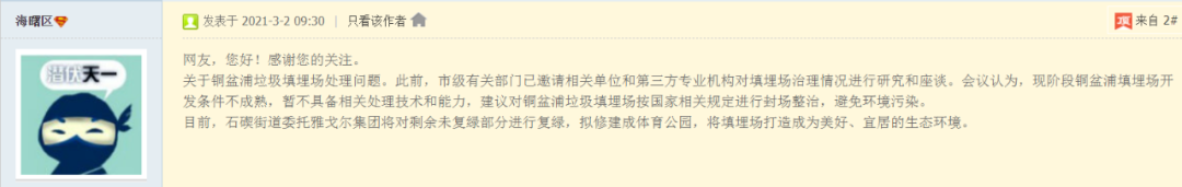 “关于铜盆浦垃圾填埋场处理问题,此前,市级有关部门已邀请相关单位和第三方专业机构对填埋场治理情况进行研究和座谈。会议认为,现阶段铜盆浦填埋场开发条件不成熟,暂不具备相关处理技术和能力,建议对铜盆浦垃圾填埋场按国家相关规定进行封场整治,避免环境污染。