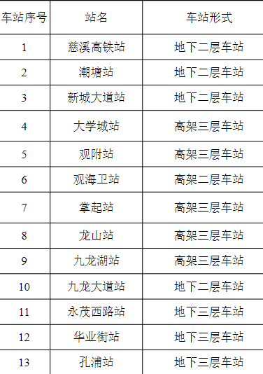 地下站7座:慈溪高铁站、潮塘站、新城大道站、九龙大道站、永茂西路站、华业街站、孔浦站。