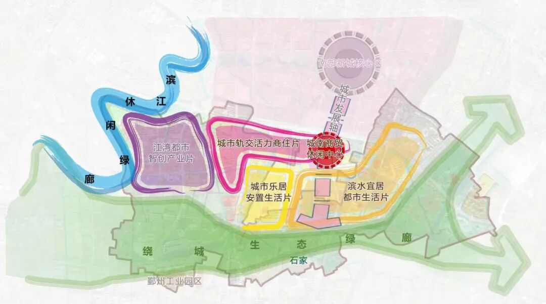 试点区规划总体格局为“两廊、一轴、一心、四片区”: