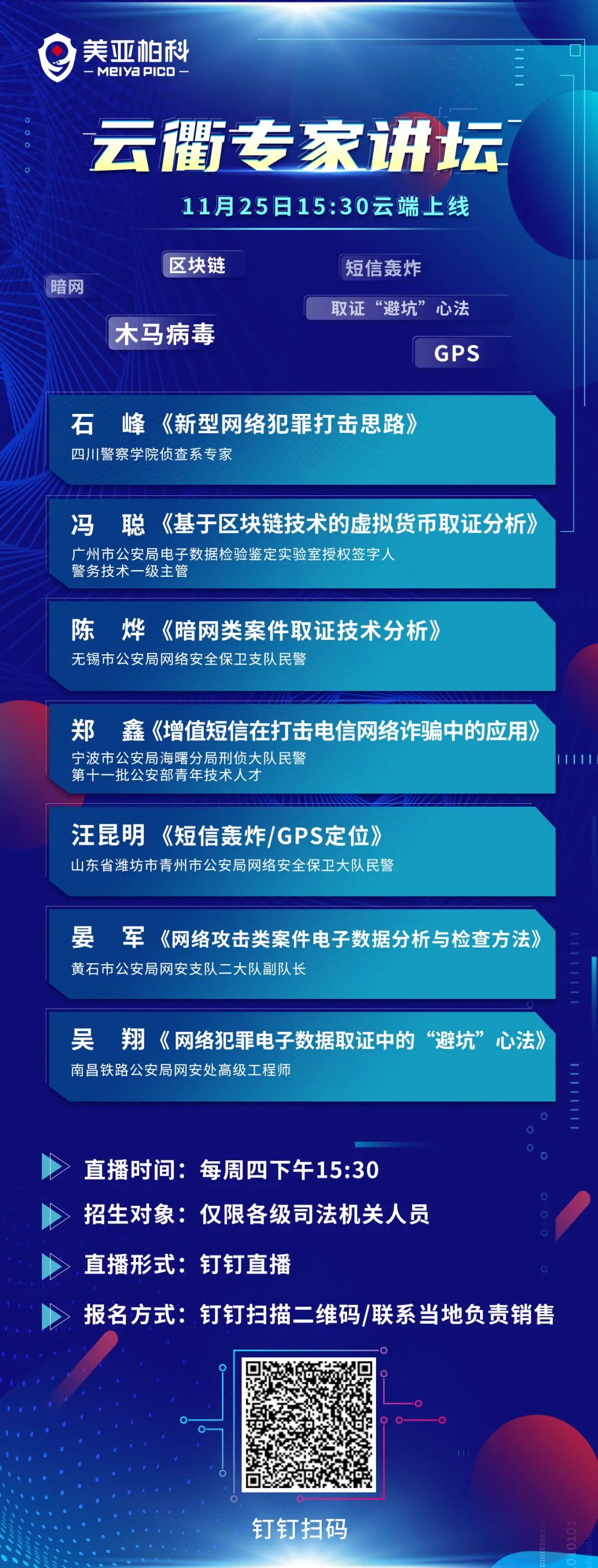 10月19日至11月11日,“云锦系列专题”活动顺利开展,内容涵盖专家讲坛篇、云勘篇、现勘篇、检验鉴定篇和研判分析篇五个篇章。活动总共推出15期钉钉直播,邀请26位美亚柏科技术专家大咖,通过取证技术结合实际案例,深度解读新型网络犯罪取证的实战应用。