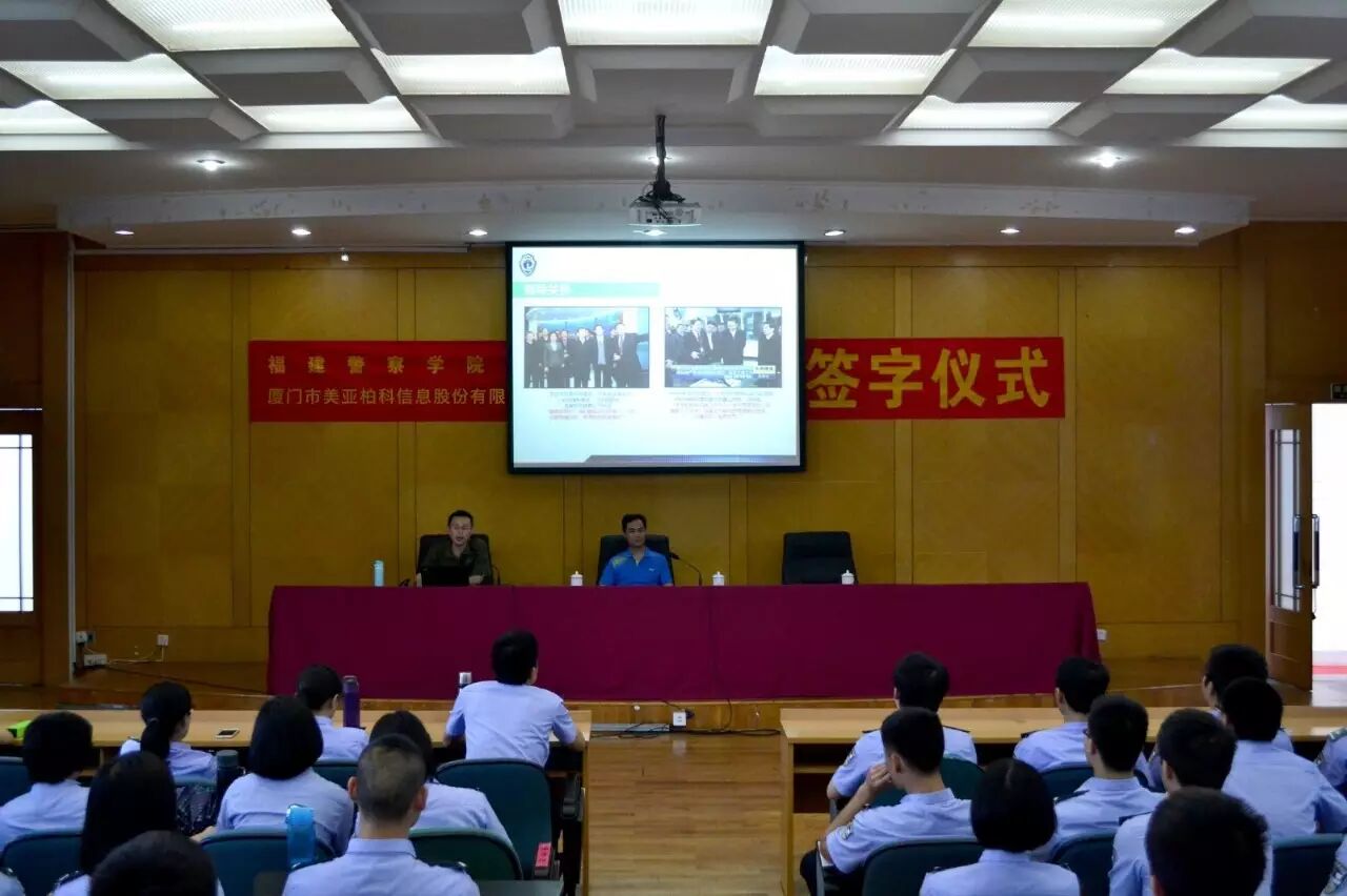 2016年6月13日,美亚柏科走进福建警察学院(以下简称“福建警院”),就双方整合资源共建信息安全专业、组建学校信息安全实训基地等事项达成校企合作。美亚柏科副总经理张雪峰携公司人力资源部门、培训部门相关负责人与福建警院副院长肖仁辉、福建警院计算机与信息管理系主任李民强及福建警院师生出席签约仪式。