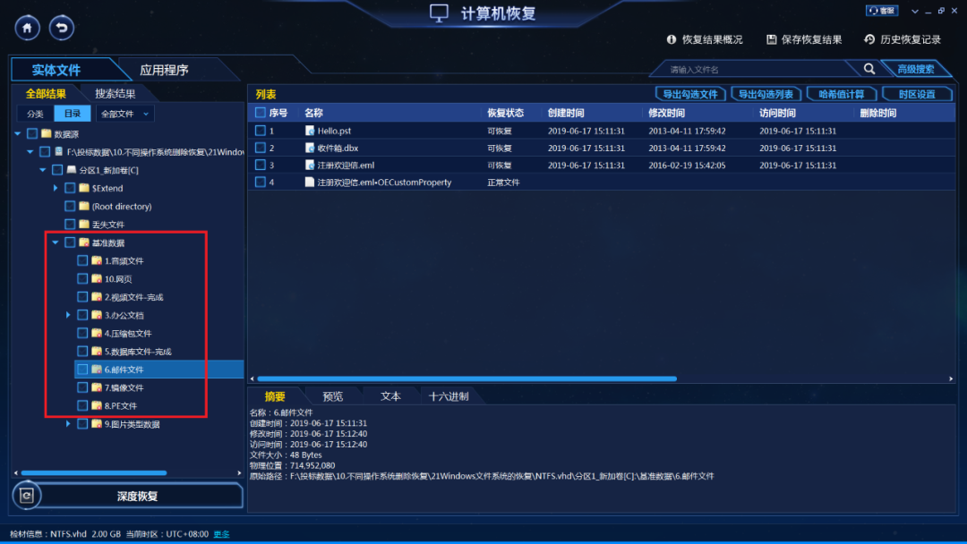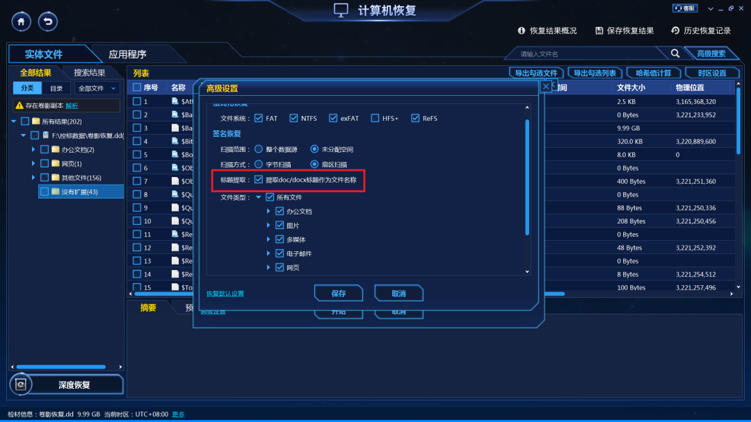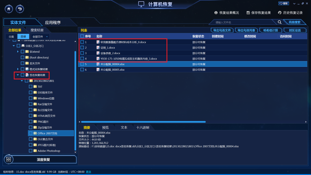 (5)如果中病毒后还有写入数据,可能破坏了原来文件系统索引,这种情况可通过深度恢复功能进一步恢复,可恢复更多丢失的音视频文件、图片文件、文档文件、压缩文件等,其中doc/docx文件可支持分析文件内容提取文件名。![]()