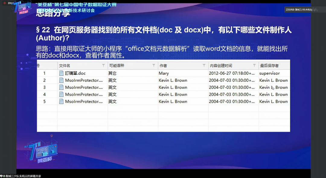 本届“美亚杯”竞技过程中,许多参赛选手在解题时使用了取证小程序。在赛后复盘环节,团体赛职业组亚军江苏盐城市公安局“瓢城三少”的技术专家朱鸣众便在分享中提到,使用“office文档元数据解析” 取证小程序进行解题,快速获取到文档作者属性信息。这也说明取证小程序的简单便利和灵活拓展等优势特点得到了取证从业者的青睐与认可。