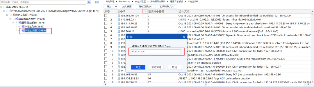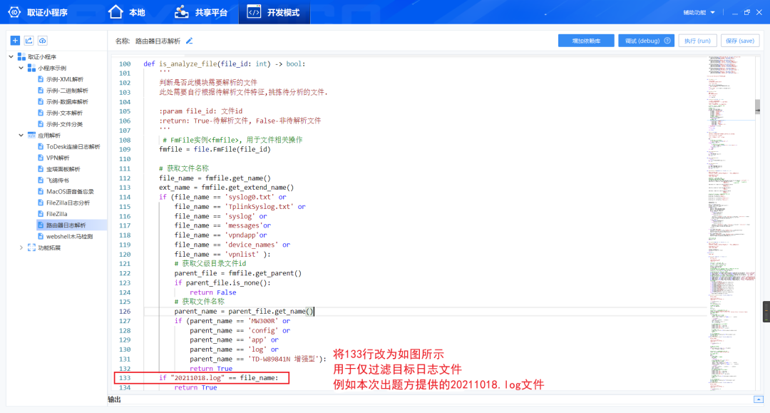 资格赛中出现“路由器日志”相关题目,推断可以使用 “路由器日志解析”小程序进行快速解题。为了更加快速精准地解析赛题中给出的日志,在“本地”进入路由器日志解析小程序详情页面,如图所示进入开发模式:运行“路由器日志解析”小程序后可以直接得到此份路由器日志中涉及的IP列表;在IP详细列表中执行题目选项所需的过滤: