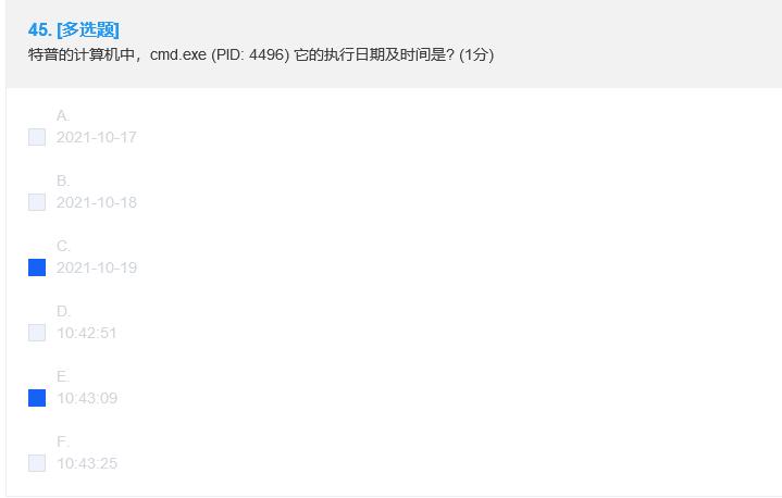 可以直接在解析结果对应的进程名称中查看到进程ID:因此,在比赛过程中通过取证小程序得出的答案为6136。可以直接在解析结果对应的进程名称中查看进程的执行日期及时间:因此,在比赛过程中通过取证小程序得出的答案为CE。团体赛中出现“office文档”相关题目,推断可以使用 “Office文档元数据解析”小程序进行快速解题。