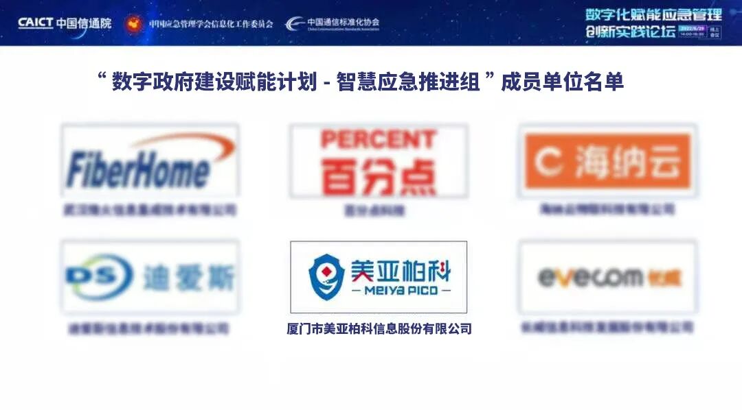 2022年6月29日,由中国信息通信研究院、中国应急管理学会信息化工作委员会、中国通信标准化协会联合主办的数字化赋能应急管理创新实践论坛举行,会议宣布成立“数字政府建设赋能计划—智慧应急推进组”,美亚柏科入选首批成员单位,新型智慧城市事业部生态合作部经理俞亮生入选技术专家名单。(点击了解详情)