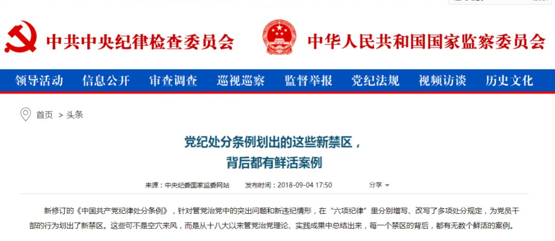 今天,中央纪委国家监委网站刊发题为《党纪处分条例划出的这些新禁区,背后都有鲜活案例》的文章。