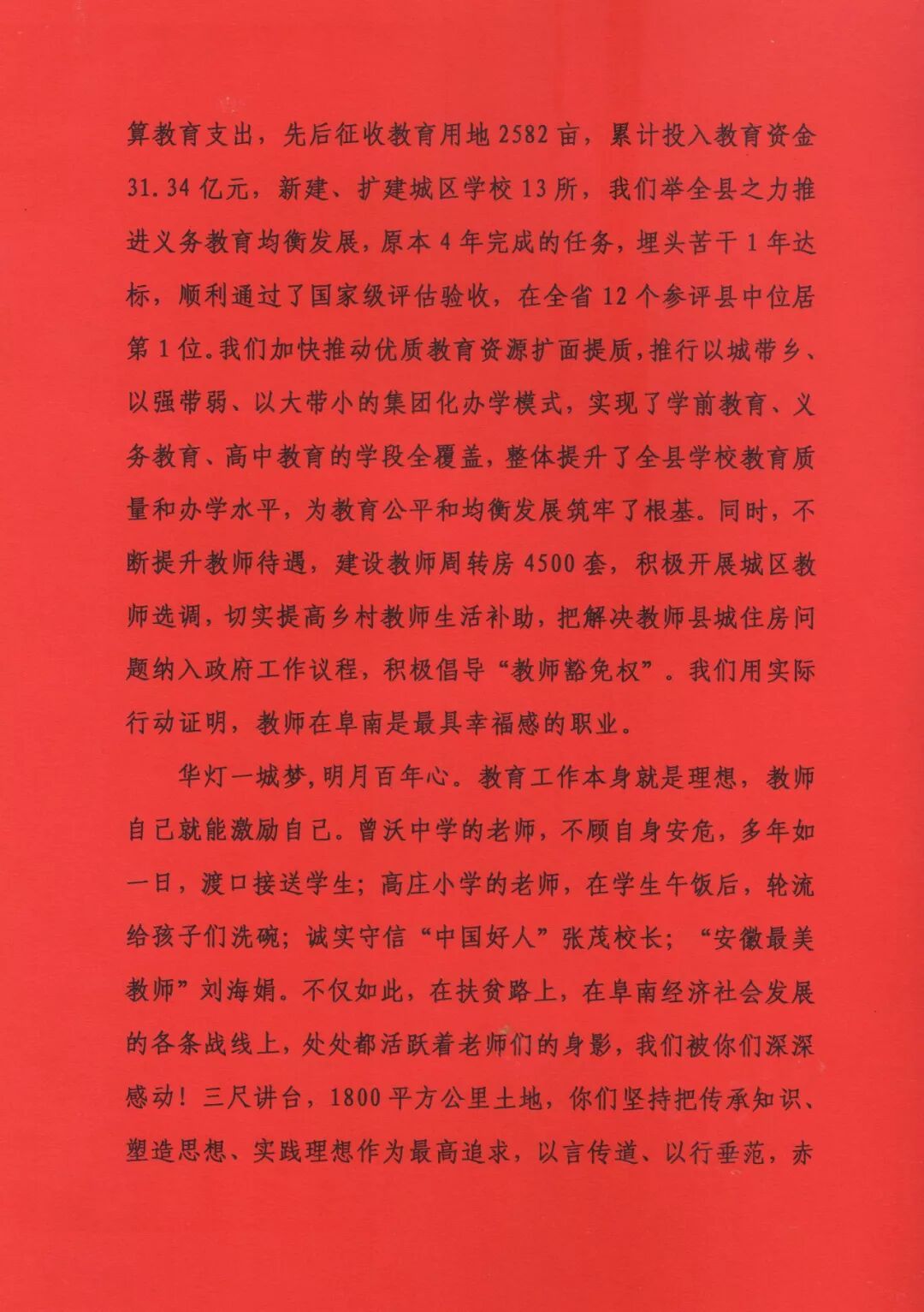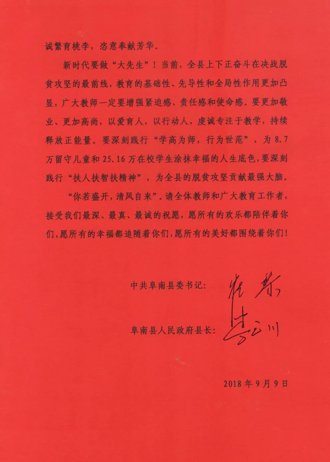 在信中,阜南县委书记崔黎和县长李云川还为全县教师点赞:“你们在平凡的岗位上创造了不平凡的业绩,赢得了172万阜南人民的赞誉和尊重,是当之无愧的灵魂工程师!”“华灯一城梦,明月百年心。教育工作本身就是理想,教师自己就能激励自己。……在扶贫路上,在阜南经济社会发展的各条战线上,处处都活跃着老师们的身影,我们被你们深深感动!三尺讲台,1800平方公里土地,你们坚持把传承知识、塑造思想、实践理想作为最高追求,以言传道、以行垂范,赤诚繁育桃李,恣意奉献芳华。”并呼吁“新时代要做‘大先生’!当前,全县上下正奋斗在决战脱贫攻坚的最前线,教育的基础性、先导性和全局性作用更加凸显,广大教师一定要增强紧迫感、责任感和使命感。”