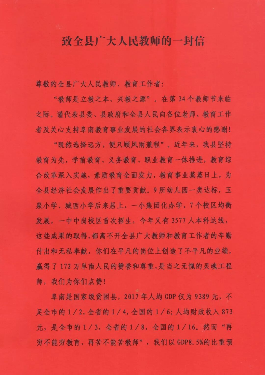 信中说,“阜南是国家级贫困县,2017年人均GDP仅为9389元,不足全市的1/2,全省的1/4,全国的1/6;人均财政收入873元,是全市的1/3,全省的1/8,全国的1/16。然而‘再穷不能穷教育,再苦不能苦教师’,我们以GDP8.5%的比重预算教育支出,先后征收教育用地2582亩,累计投入教育资金31.34亿元,新建、扩建城区学校13所,我们举全县之力推进义务教育均衡发展,原本4年完成的任务,埋头苦干1年达标,顺利通过了国家级评估验收,在全省12个参评县中位居第1位。”