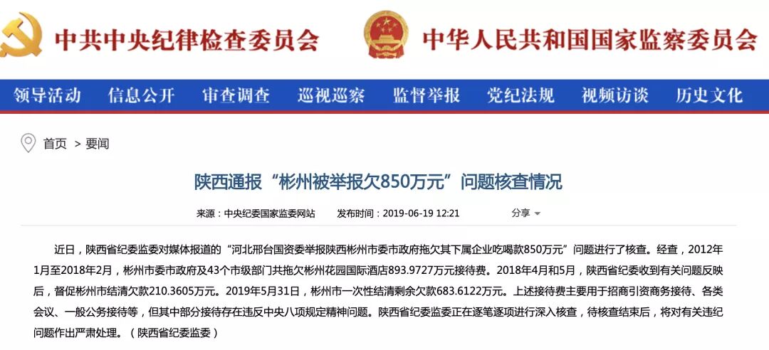 这周三,核查结果出来了。陕西省纪委监委通报,2012年1月至2018年2月,彬州市委市政府及43个市级部门共拖欠彬州花园国际酒店893.9727万元接待费,其中部分接待存在违反中央八项规定精神问题。