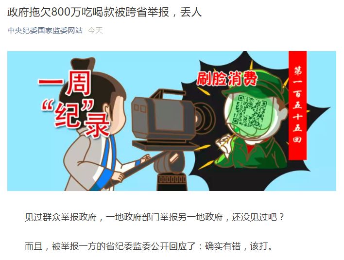 今天,中纪委又发表了一篇很“皮”的文章,评论“政府拖欠800万吃喝款被跨省举报”事件。