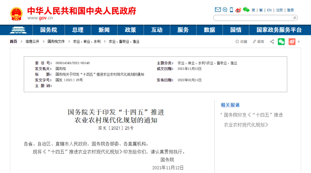 国务院关于印发“十四五”推进农业农村现代化规划的通知