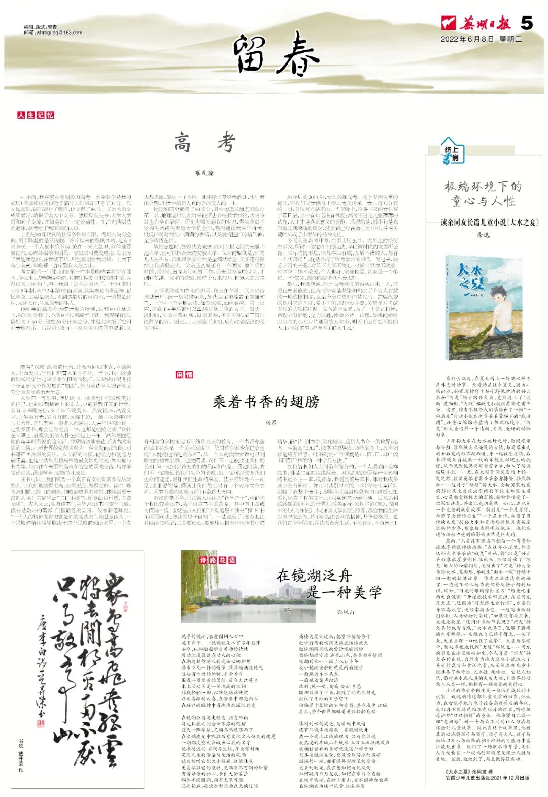 2022年6月8日出版的《芜湖日报》,刊发了现任安徽省政府外事办公室(省政府港澳事务办公室)党组书记、主任雍成瀚的回忆文章《高考》。