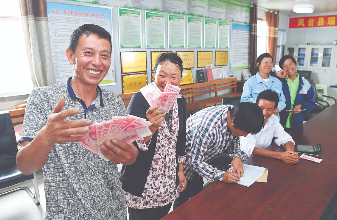 图为凤台县工人展示刚刚发放的工资。当地农户将土地托管给合作社的同时选择入社务工,增加收入。摄影/ 程 兆