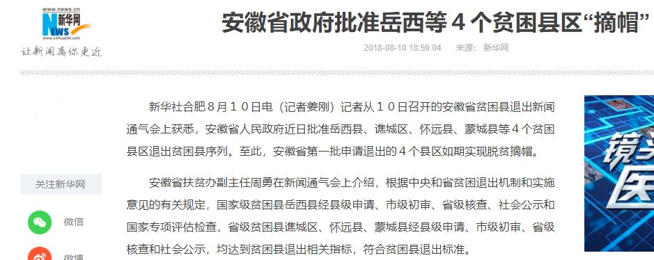 2018年8月,经过严格的考核公示之后,安徽省人民政府批准岳西县、谯城区、怀远县和蒙城县成为安徽首批四个“摘帽县”。
