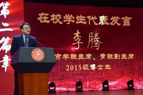 此前的2018年10月,上海交大电子信息与电气工程学院110周年纪念大会举行。李腾代表全体在校生向电院表达衷心的生日祝福。李腾表达了作为电院人的自豪感,在电院学习生活是无比幸运的,在这里可以接受浓厚学术氛围的熏陶,并且打下良好的数理基础,世界各地的学术报告给同学们许多与学术大咖交流的机会,同时,学生会又带给他许多成长的经历,他认为电院赋予了学生敢为人先的底色、脚踏实地的执着、履行使命的担当。