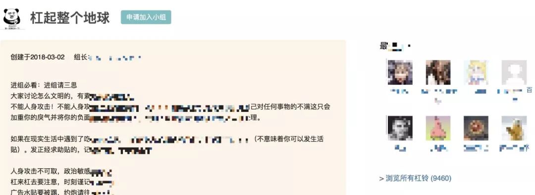 豆瓣小组“杠起整个地球”成立于2018年3月2日,截止4月20日0点已有9460位用户加入。图片:来自豆瓣网页截图。