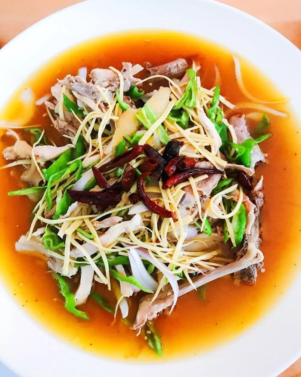 ★主厨推荐:这是一道清汤椒麻鸡,汤底呈金黄色,并没有一丝油花,看上去和吃起来都很清爽,鸡也很入味。这盘椒麻鸡别具特色,一是老板依据个人口味,在椒麻鸡中添加了切丝豆腐皮,除了肉味,口感上更富有层次;二是汤汁以中药秘方熬制而成,不仅有着浅浅药香,更能实现补气养血的养生功效。