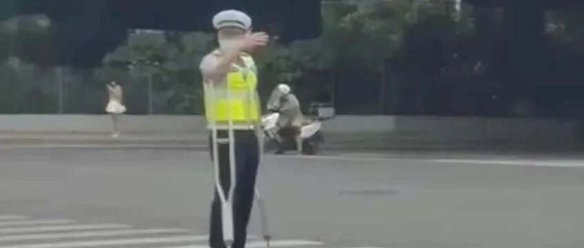 拄双拐的交警站马路,是人为摆拍还是民警敬业?
