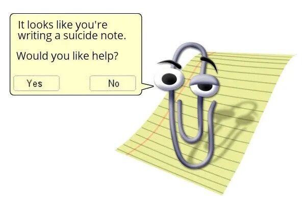 每当这张表情包出现在各大论坛里,用户们总是忍不住想要发泄一回当年被Clippy骚扰之苦,久而久之,越来越多的人信以为真,认为Clippy真的会在人悲痛欲绝写下遗书时发出不适时宜的“热情帮助”,进而对它的讨厌又加深了一分。