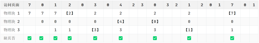 依此类推,釆用最佳置换算法时的情况如下图所示,可以看到,发生缺页中断的次数为 9,页面置换的次数为 6(图中 【】 标识的即为发生了页面置换)
