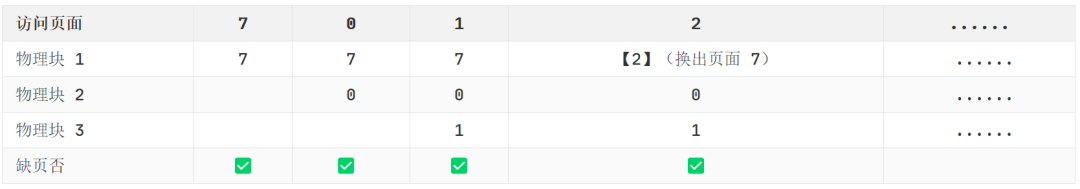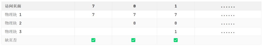 1)进程运行时,先将 7, 0, 1 三个页面依次装入内存(下图中的『缺页』表示内存中没有该页面,需要从磁盘中调入)