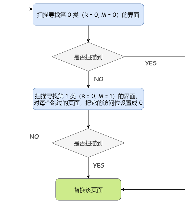 1)从指针的当前位置开始,扫描循环队列。在这次扫描过程中,对访问位不做任何修改。选择遇到的第一个是第 0 类 “未被访问,未被修改 (Referenced bit = 0,Modified bit = 0)” 的页面用于替换