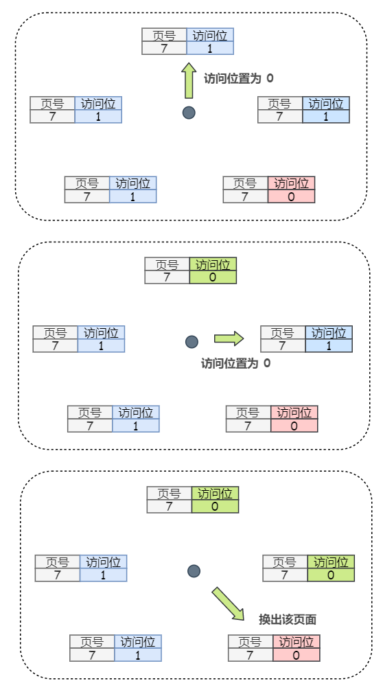 3)如果第 2) 步失败,指针将回到它的最初位置,并且集合中所有页面的访问位都已经被设置为 0 了。重复第 1 步,并且如果有必要,重复第 2 步。这样一定可以找到供替换的页面。
