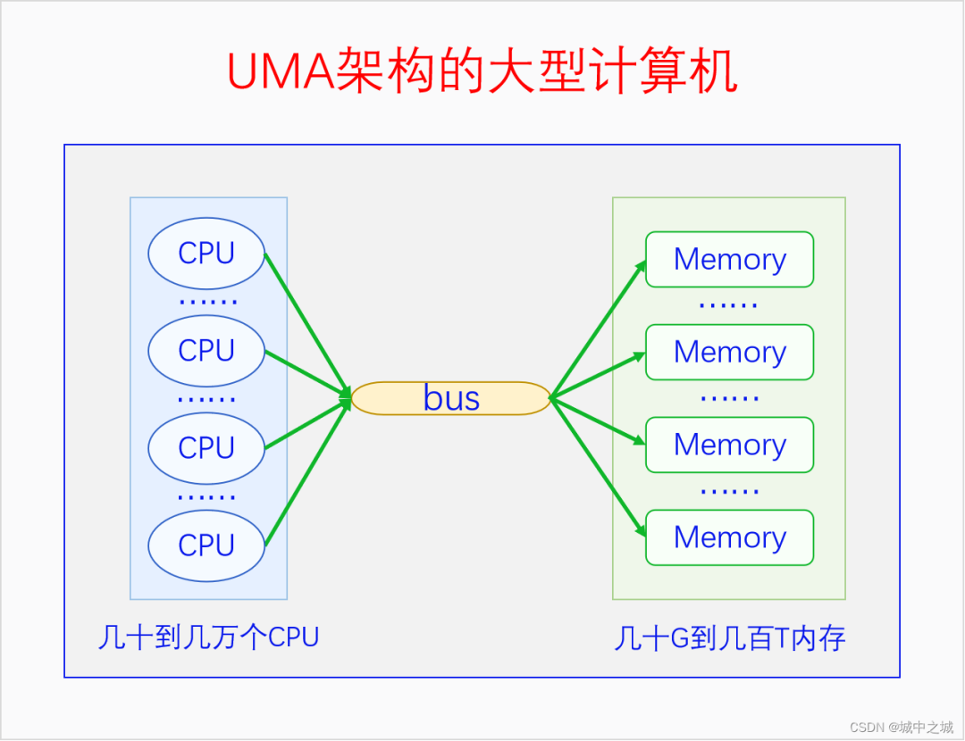 我国的省为什么要按照现在的这个形状来划分呢,主要是依据山川地形还有民俗风情等历史原因。那么物理内存划分为节点的原因是什么呢?这就要从UMA、NUMA说起了。我们用三个图来看一下。