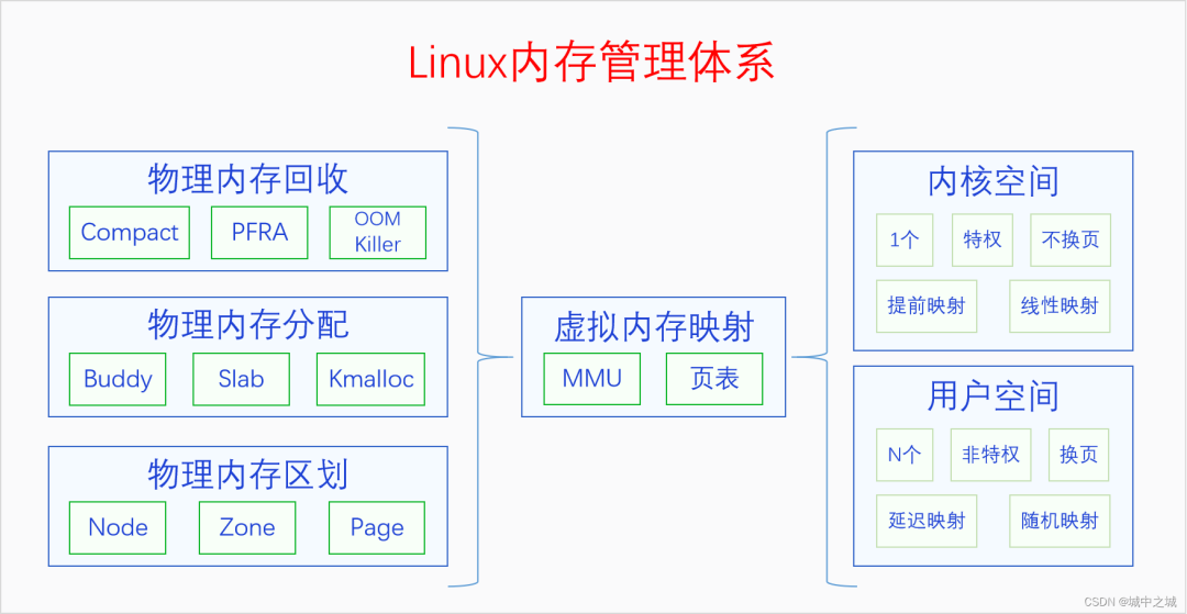 前面我们讲了这么多的东西,现在再来总结回顾一下。首先我们再重新看一下Linux的内存管理体系图,我们边看这个图边进行总结。首先要强调的一点是,这么多的东西,都是在内核里进行管理的,内核是可以操作这一切的。但是对进程来说这些基本都是透明的,进程只能看到自己的虚拟内存空间,只能在自己空间里分配虚拟内存,其它的,进程什么也看不见、管不着。