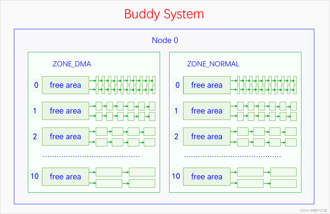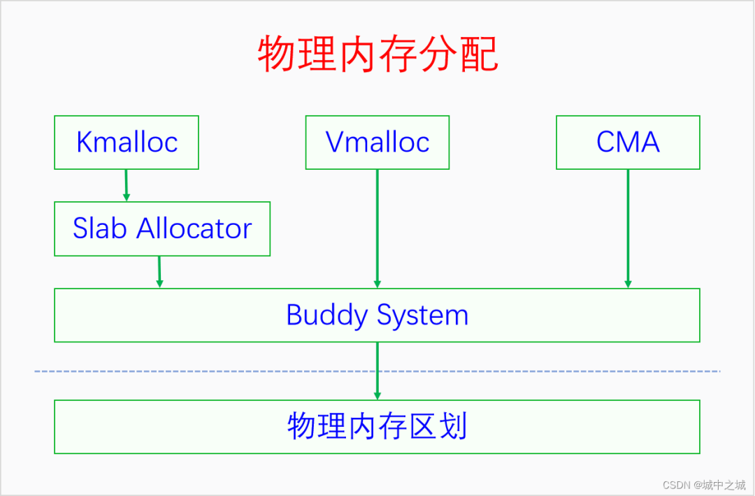 对物理内存建立三级区域划分之后,就可以在其基础之上建立分配体系了。物理内存的分配体系可以类比于一个公司的销售体系,有工厂直接进行大额销售,有批发公司进行大量批发,有小卖部进行日常零售。物理内存的三级分配体系分别是buddy system、slab allocator和kmalloc。buddy system相当于是工厂销售,slab allocator相当于是批发公司,kmalloc相当于是小卖部,分别满足人们不同规模的需求。