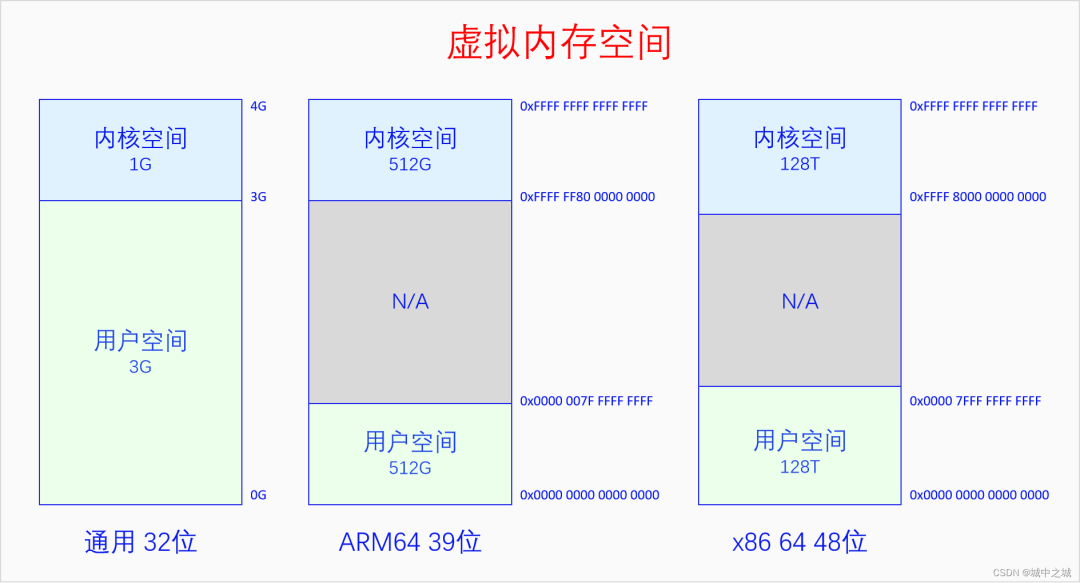 在32位系统上默认是内核占据上面1G虚拟空间,进程占据下面3G虚拟空间,有config选项可以选择其它比列,所有CPU架构都是如此。在64位系统上,由于64位的地址空间实在是太大了,Linux并没有使用全部的虚拟内存空间,而是只使用其中一部分位数。使用的方法是把用户空间的高位补0,内核空间的高位补1,这样从64位地址空间的角度来看就是只使用了两段,中间留空,方便以后往中间扩展。中间留空的是非法内存空间,不能使用。具体使用多少位,高位如何补0,不同架构的选择是不同的。ARM64在4K页面大小的情况下有39位和48位两种虚拟地址空间的选择。X86 64有48位和57位两种虚拟地址空间的选择。ARM64是内核空间和用户空间都有这么多的地址空间,x86 64是内核空间和用户空间平分这么多的地址空间,上图中的大小也可以反应出这一点。