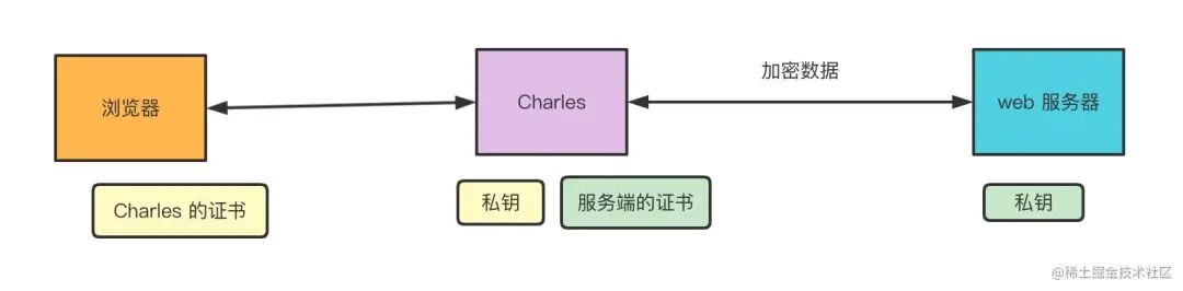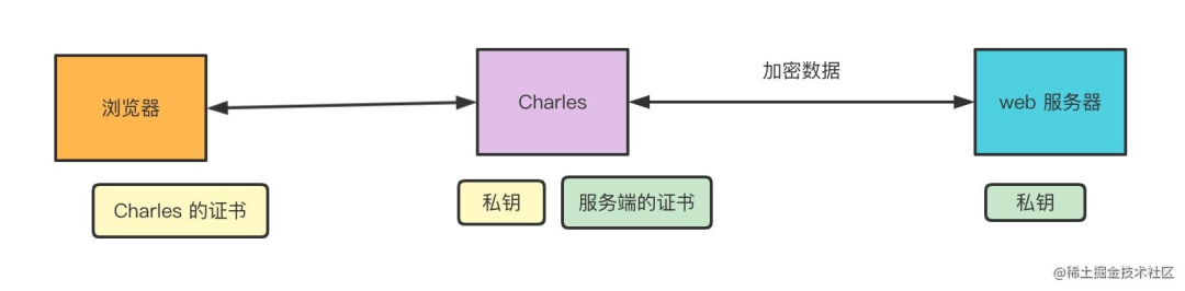 Charles 自己用服务端的证书来和服务端通信,然后给浏览器一个自己的证书,这样就能解密传输的内容,拿到明文数据了。