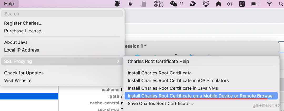 点击 help > SSL Proxying > Install Charles Root Certificate,安装到系统的钥匙串中: